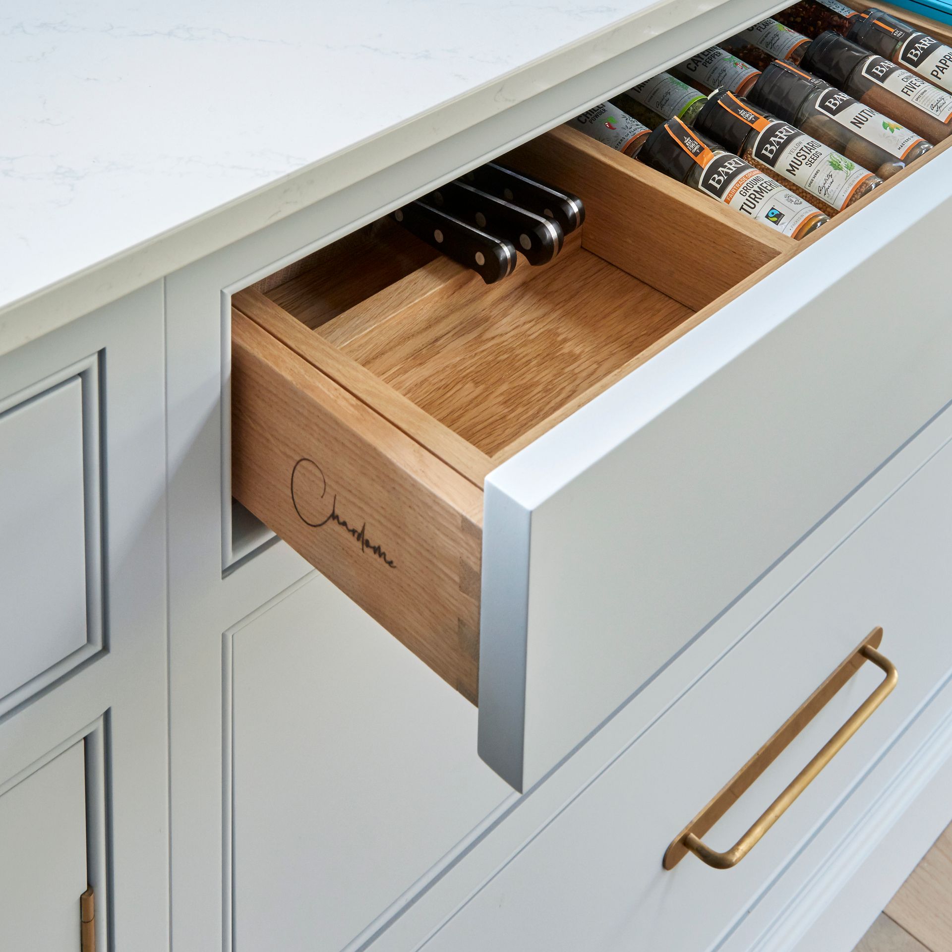 The client wanted lots of specific storage solutions so we created bespoke elements such as the spice rack next to the cooker, cutlery dividers, the knife drawer and a tea organiser.